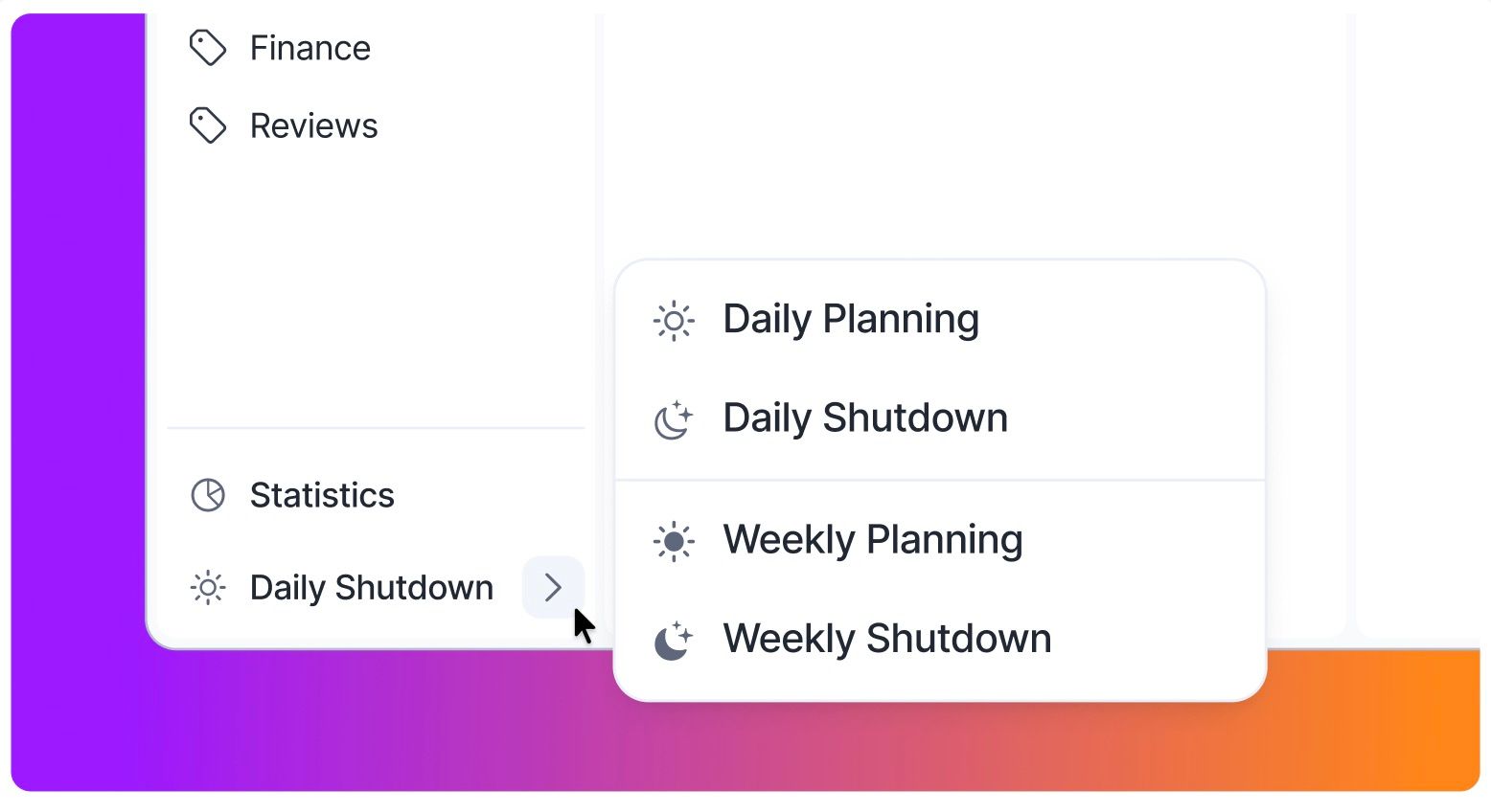 As your workday comes to a close, the Daily Shutdown ritual helps you wrap up and review everything you've accomplished.