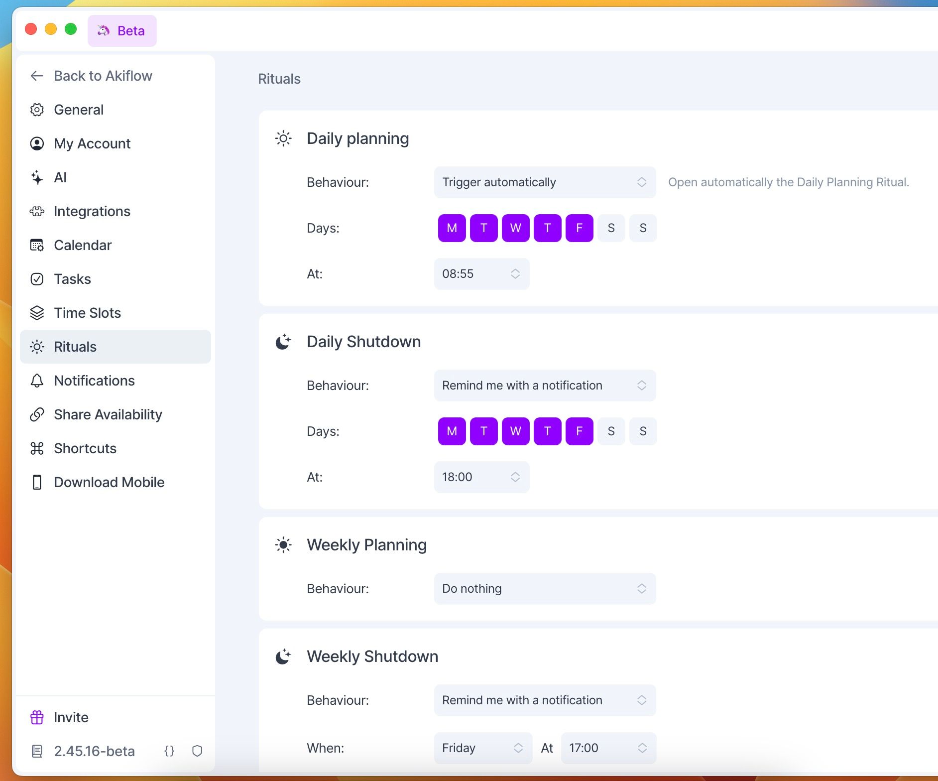 Go to Settings > Rituals to customize when Akiflow should remind you to do your Rituals.